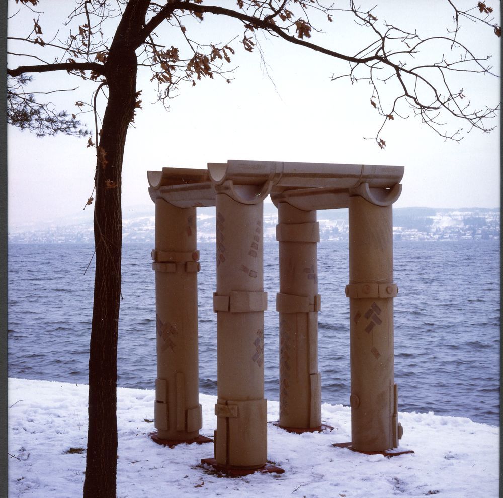 Tecnica: Freistehend und in Segmenten montiert. 1250 °C Reduktionsbrand.
