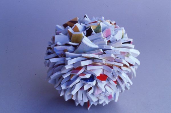 Technique: Pieces of broken porcelain are glued onto a suface of a porcelain ball. The work was not fired.