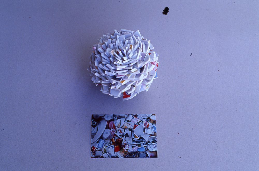Material: Broken porcelains plates, cups, etc. Refuse from a porcelain factory, glue, photograph of the material used for the work.